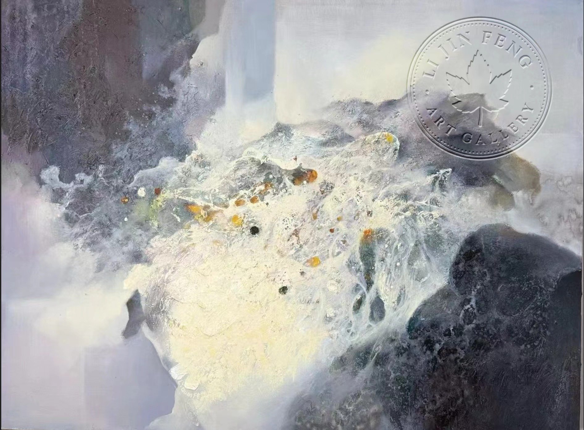 在这幅作品中,白色的能量并非单纯地铺陈,而是以一种“生成”的姿态向深黑的褶皱推进,仿佛自然力量在沉默的岩壁间寻找自己的路径。浅紫微雾绕着山石的轮廓散开,使画面在密与疏之间悬浮出一种独特的“气场”——这不是景象的再现,而是李泉枫以油彩构筑的思想实验,将人类的经验与自然的法则置于同一块画布上对照。