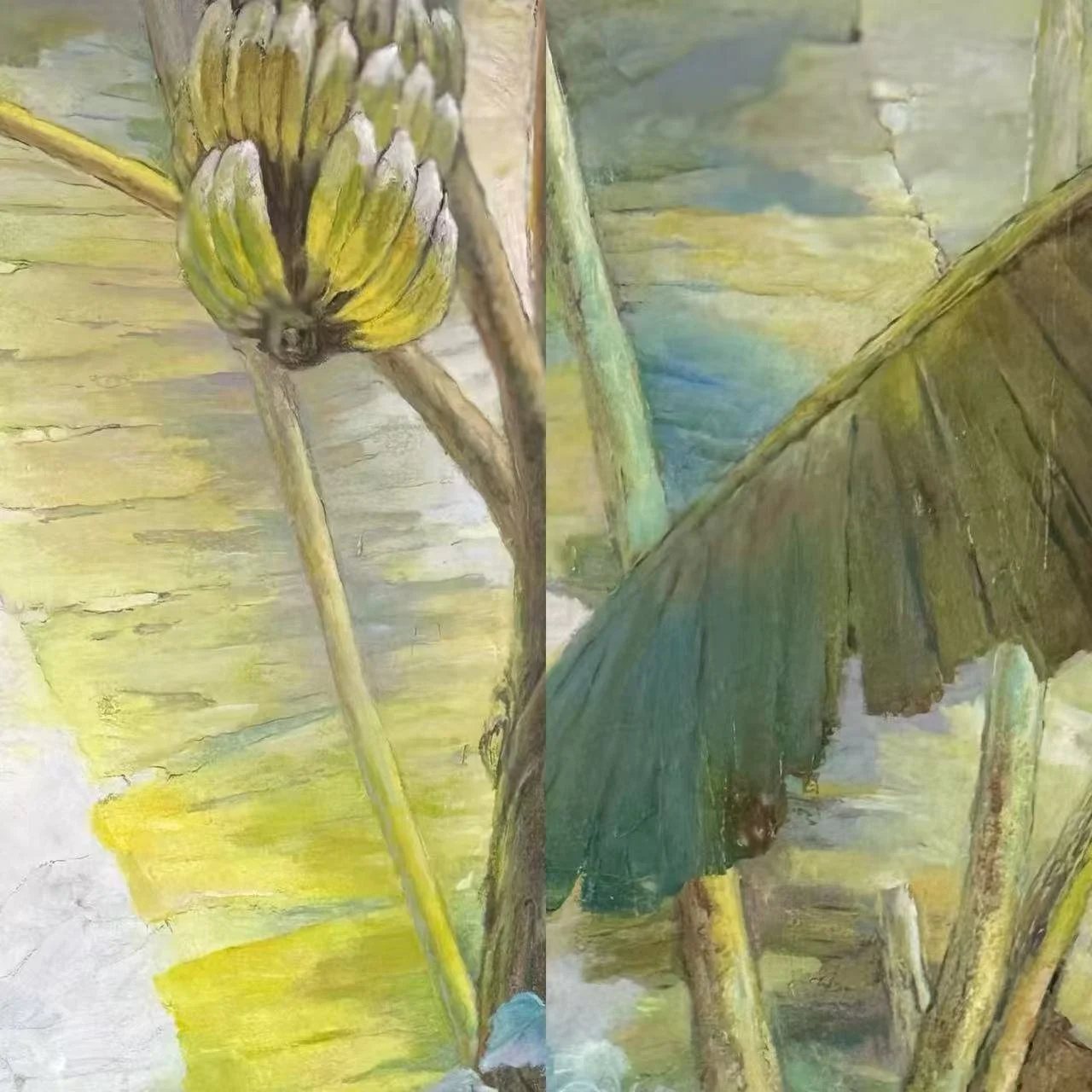 芭蕉的青幹是春的脊,托着半熟的蕉串垂于画的眉梢——那裹着浅黄的果簇,像积攒一冬的晴光,正顺着叶脉向画布的褶皱里渗。阔叶如帷,被风揉出淡绿与鹅黄交映的晕染,这是中式设色里“取气不取形”的温柔,并将春虚化的灵裹成可触的肌理呈现于眼前。