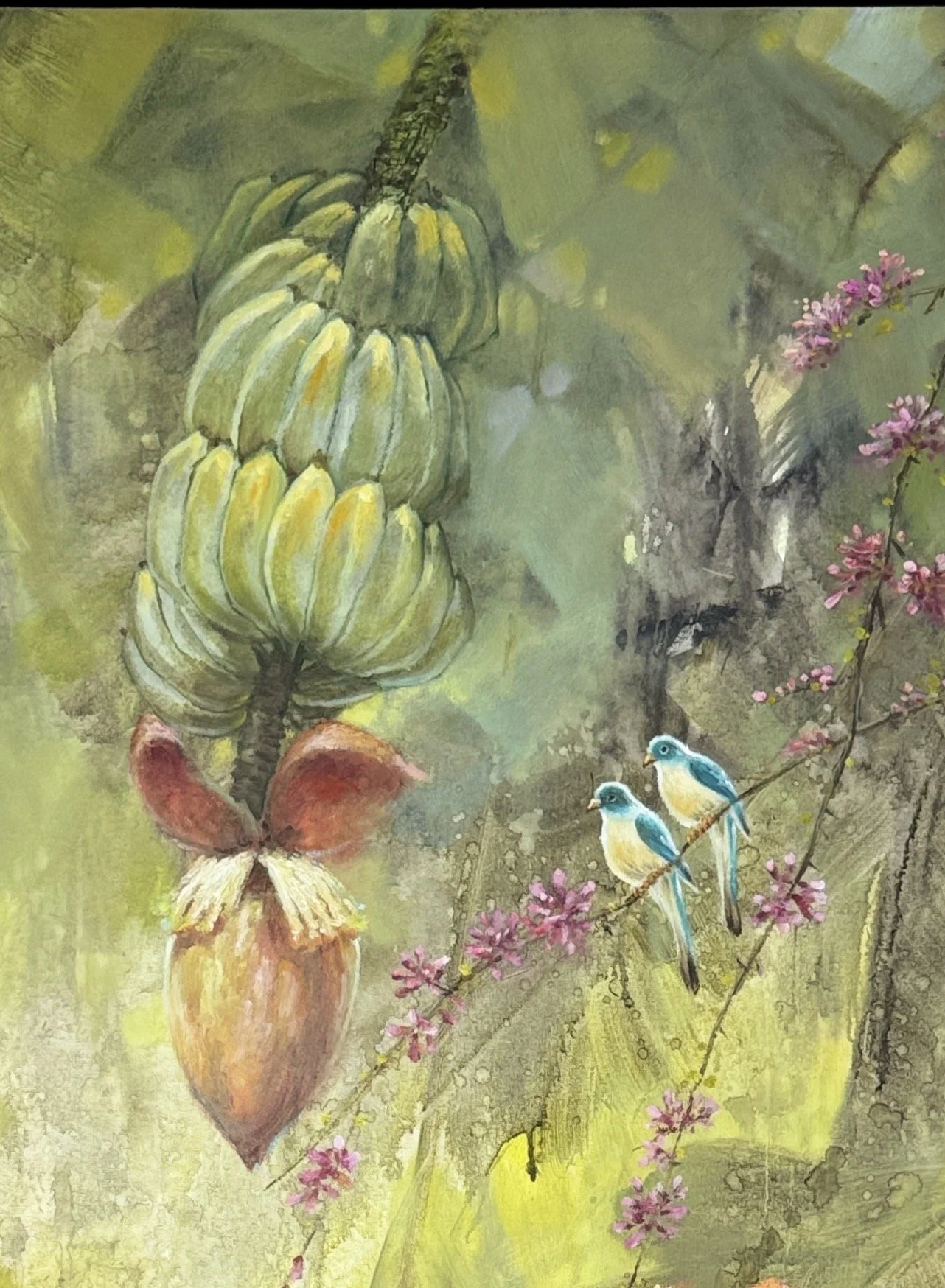 蕉叶的清翠缓缓流淌于画布,紫荆的柔紫如轻纱绕枝垂落。这幅以热带春意为情的画作,于无声处让自然生机与东方美学轻轻共鸣。画面以层叠的黄绿为主调,浅黄像春日晨光柔柔洒下,深绿似蕉叶攒住的温润水汽;色彩在晕染中流动,如春风轻拂热带阡陌,不追求轮廓的雕琢,却让“满园春色”的鲜活与温煦,从每一笔、每一道晕染里,缓缓溢出,直抵心底