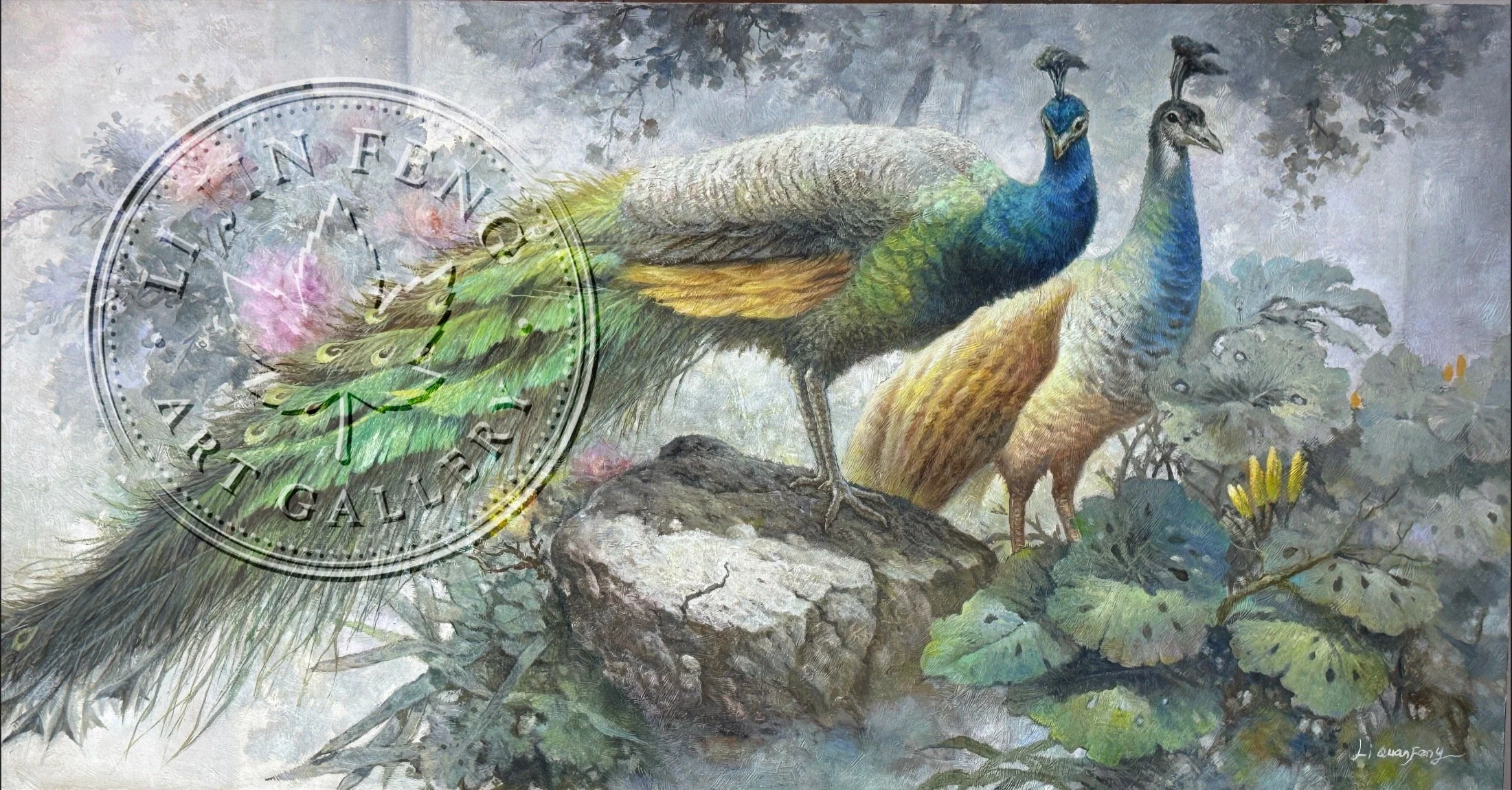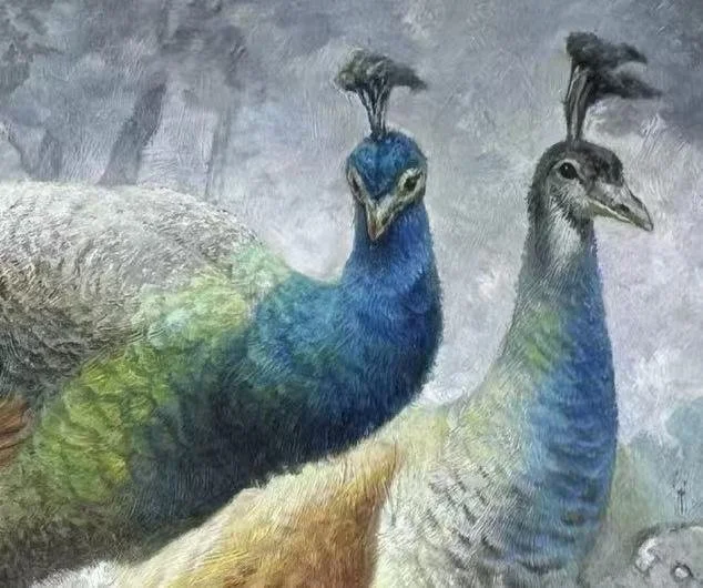 李全凤先生笔下的孔雀与石,浸着春光的温润,又暗含东方风水的深意。雄孔雀颈部映釉光,如古瓷凝烟;尾羽铺展如流泉,绿羽叠金,每一片眼纹似如春阳透过叶隙的光斑,悄然织进羽翼之中。雌雀羽色浅焙米黄,柔褐点缀,如春光晕开,映衬出雄雀翠羽的柔亮,也让石的冷峻更显温和。